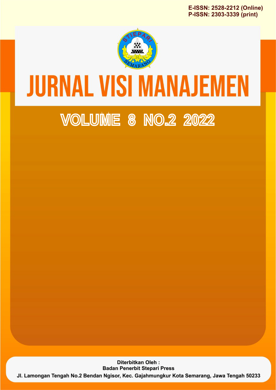 Vol. 8 No. 3 (2022)Jurnal Visi Manajemen E-ISSN: 2528-2212 (Online) / P-ISSN: 2303-3339 (print) diterbitkan oleh Sekolah Tinggi Ilmu Ekonomi Pariwisata Indonesia Semarang. . Penerbitan jurnal ini bertujuan untuk meningkatkan kualitas ilmu pengetahuan, serta menyalurkan minat berbagi dan menyebarluaskan ilmu pengetahuan kepada akademisi, mahasiswa, praktisi dan pemerhati ilmu pengetahuan. Redaksi menerima artikel penelitian terkait Ilmiah Manajemen Bisnis Dan Kewirausahaan dan terbit tiga kali dalam setahun yaitu edisi Januari, Mei dan September.