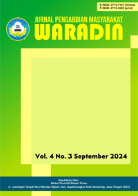 Vol. 5 No. 3 (2025)Jurnal Pengabdian Masyarakat Waradin, adalah jurnal yang menerbitkan artikel-artikel penelitian sebagai hasil pengabdian masyarakat yang telah memiliki Nomor E-ISSN: 2774-7107 (Online) / P-ISSN: 2774-3349 (print) diterbitkan oleh Sekolah Tinggi Ilmu Ekonomi Pariwisata Indonesia Semarang. Focus dan Scope pada bidang pendidikan, Hukum, Ekonomi, Humaniora, Teknik, Pertanian, Komunikasi, Kesehatan, dan Rekayasa. Jurnal Pengabdian Masyarakat Waradin memuat publikasi hasil kegiatan pengabdian masyarakat, model atau konsep dan atau implementasinya dalam rangka peningkatan partisipasi masyarakat dalam pembangunan, pemberdayaan masyarakat atau pelaksanaan pengabdian kepada masyarakat. Jurnal Pengabdian Masyarakat Waradin terbit 1 tahun 3 kali (Januari, Mei, September)